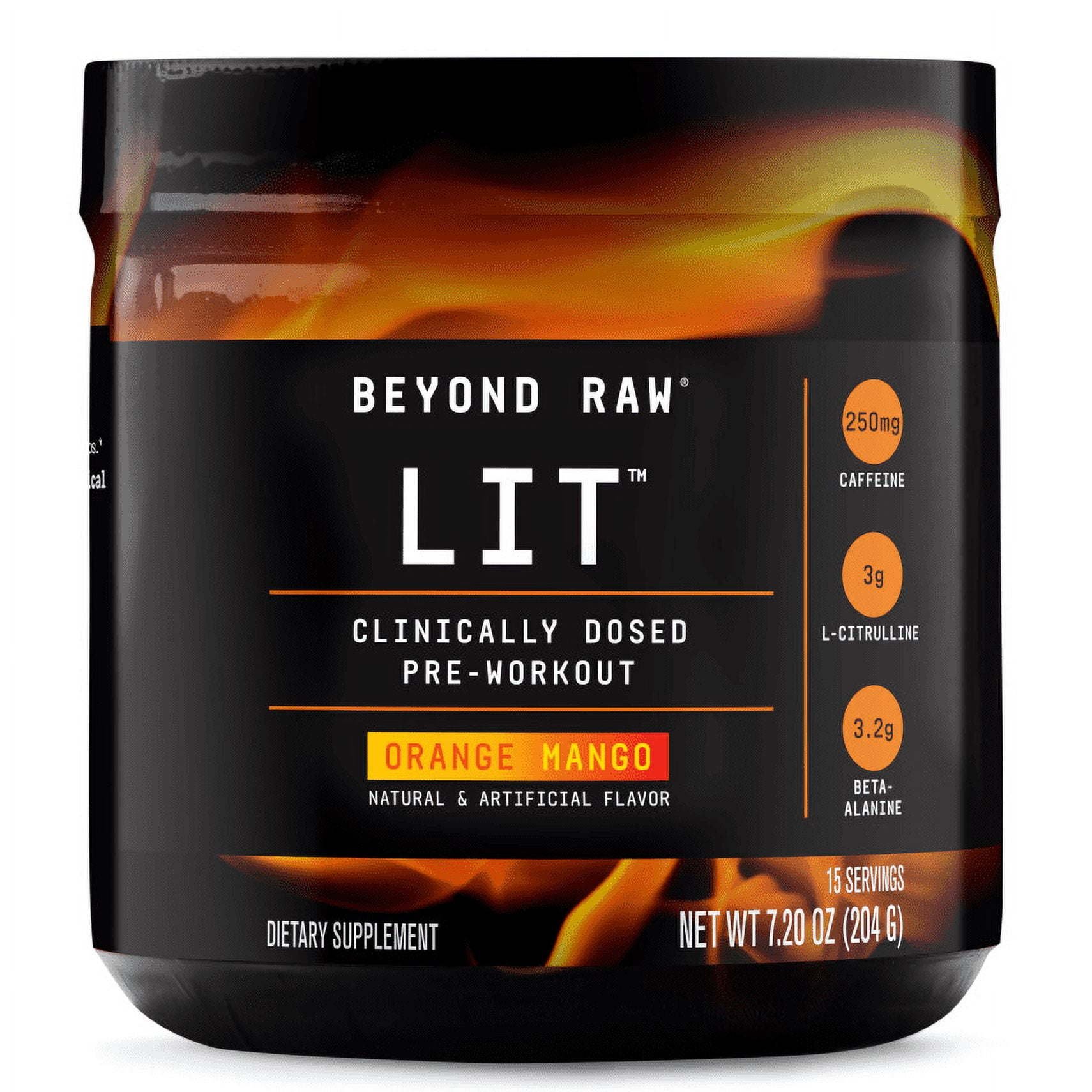 Get Lit with the category-defining pre-workout that is clinically dosed to help you train with energy, focus, intensity, and pumps*. Each serving of Beyond Raw® LIT™ Pre-Workout Powder, Orange Mango, 7.20 oz, 15 Servings, features proven ingredients at proven doses for unmatched results, including 3.2g CarnoSyn beta-alanine, 100mg NeuroFactor™, 150mg ElevATP®, and 250mg of caffeine to fuel energy and mental intensity plus 1.5g Nitrosigine® and 3g L-Citrulline for pumps and nitric oxide support*. Zero sugar and gluten free. Beyond Raw - built by science, driven by obsession, and elevated through innovation.