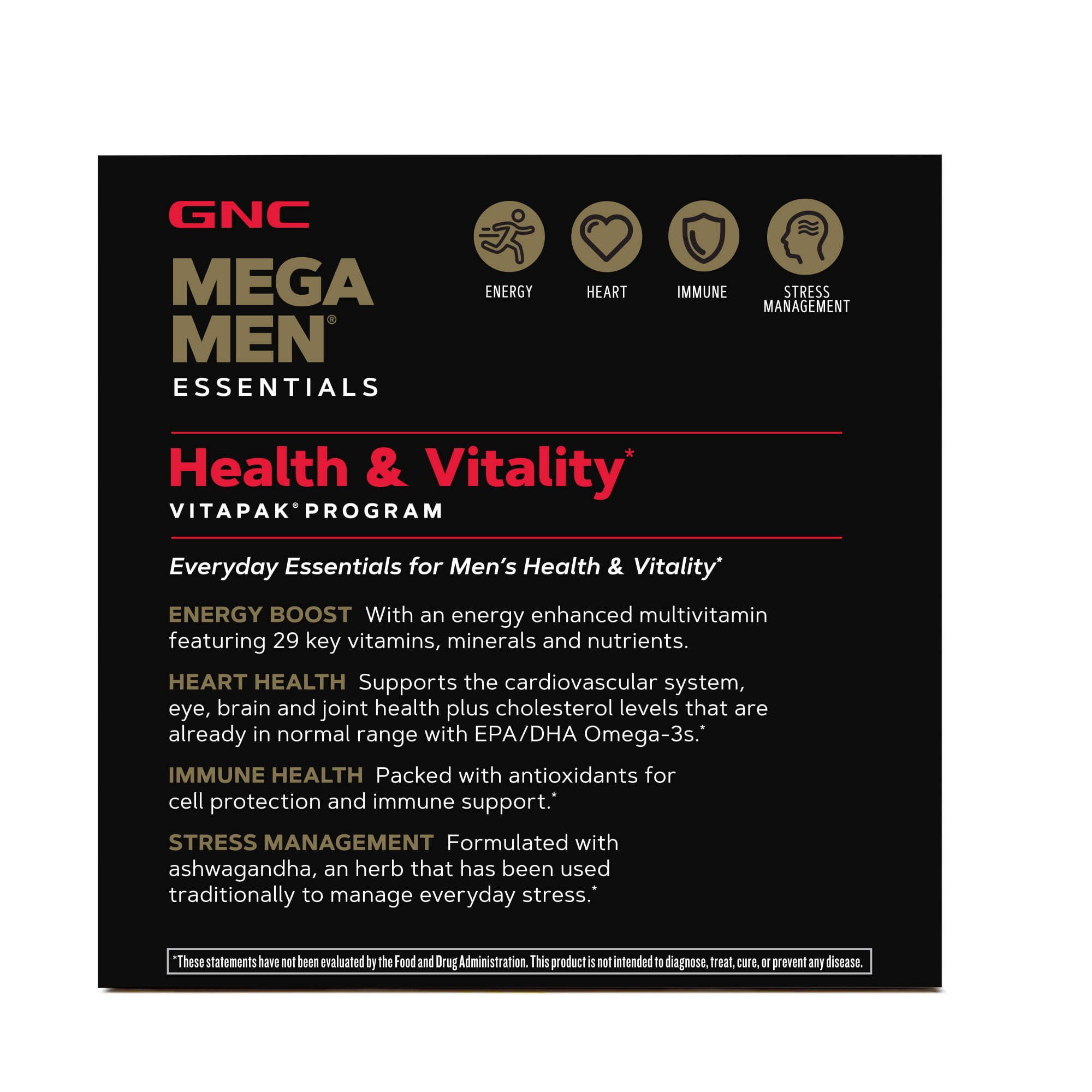 GNC Mega Men® Health & Vitality Vitapak is a comprehensive 4-in-1 nutrition program that is customized to deliver everyday essentials for Complete Men’s Health and Wellness support*. Each Daily Vitapak combines the benefits of 4 powerful formulas, including our GNC Mega Men® Energy One Daily Multivitamin and Concentrated Omega-3 Fish Oils plus formulas to support Stress Management and Immune Health - all in convenient daily packs that take the guesswork out of your nutrition regimen*. GNC Mega Men® Health & Vitality Vitapak is expertly crafted with a customized combination of vitamins, minerals, nutrients, herbs, Amino Acids, and Omega-3 Fish Oils to support Men’s Health, Energy, Mental Focus, Stress Management, and Muscle Function plus Immune, Heart, Brain, and Joint Health for unmatched nutritional support and incredible value*.