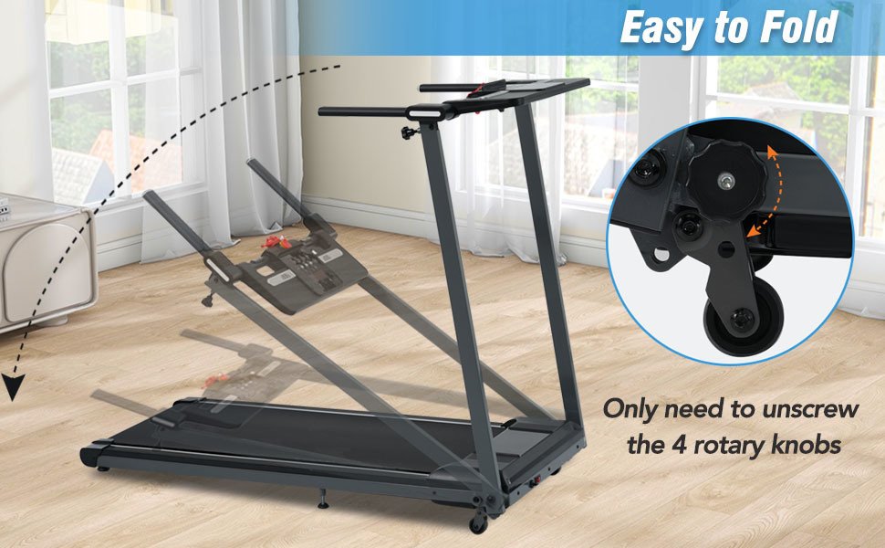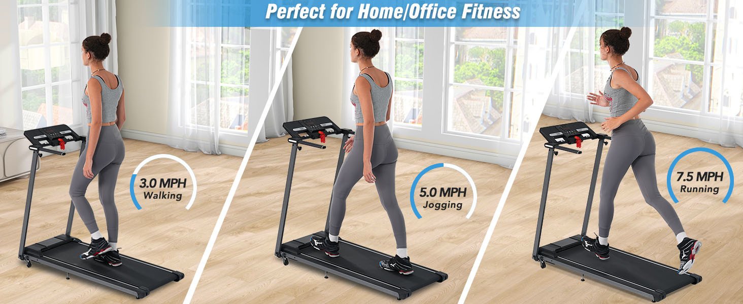 New Treadmill for Home - The lightweight, foldable design of this folding treadmill makes it easy to fold, move and store, perfect for walking, jogging and running at home/office/apartment, making it the perfect choice for home workouts.2.5HP Powerful Motor - Featuring a powerful 2.5HP ultra-quiet motor that ensures stable operation of the machine and also provides a quiet movement environment. Adjustable speed of 0.5-7.5 mph, supports up to 265 lbs. capacity and operates at no more than 55 decibels.Larger Running Area - The 15.55" x 39.76" running belt provides plenty of space for exercise and a safer, more comfortable experience for your run. It's not just a regular treadmill either, it's also suitable for your family and pets.Fitness Tracking Display -- Our portable Treadmill is designed with a LED display to show speed, distance, time, and calories burned, allowing you to visualize your exercise and maintain motivation. You can control the speed or stop the treadmill by pressing the remote control.Protect Your Knees -- 5 layer anti-slip belt of this desk treadmill is designed to absorb the force of your step, to protect your joints and ligaments from damage.Manual Incline Without Tools: Effortlessly activate adjust incline in just 2 seconds. Compared to regular walking pad, its 3% incline design enhances fat-burning efficiency by up to 30%! Tested for short workouts during work or home breaks, it provides a simulated hill-like exercise experience, effectively shapes the glutes and legs.