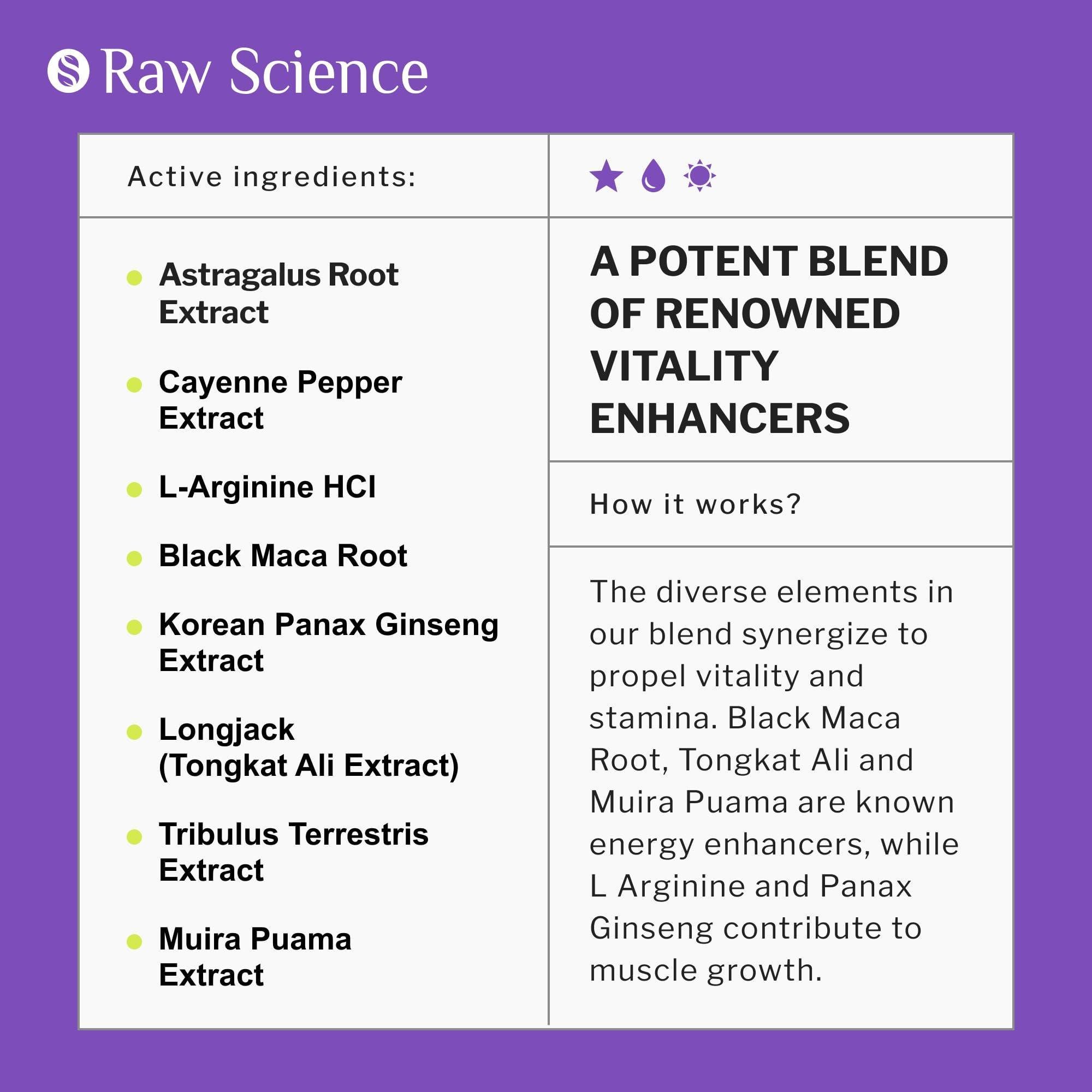5.energy and stamina support- this combination doesn't associated with high doses risks of l arginine 1000mg or maca root 4000mg supplements, providing targeted support where needed most. raw science multivitamin for men carefully balancing l-arginine hcl with natural enhancers like red panax ginseng.