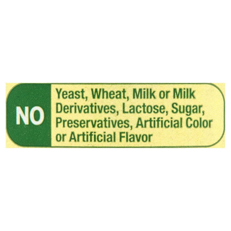 No yeast, wheat, milk or milk derivatives, lactose, sugar, preservatives, artificial color or artificial flavor
