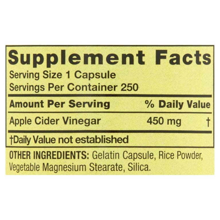 Spring Valley Apple Cider Vinegar Dietary Supplement Value Size, 450 mg is designed to bring the health benefits of vinegar to your daily life. Each capsule contains 450 milligrams of apple cider vinegar. The suggested adult dosage is one to three capsules daily, preferably with a meal and plenty of water. These capsules are free of yeast, wheat, milk or milk derivatives, lactose, sugar, preservatives, artificial colors, and artificial flavors. You can rest assured that our Spring Valley Apple Cider Vinegar Dietary Supplement Value Size, 450 mg is produced with strict quality guidelines and backed by our quality guarantee.
