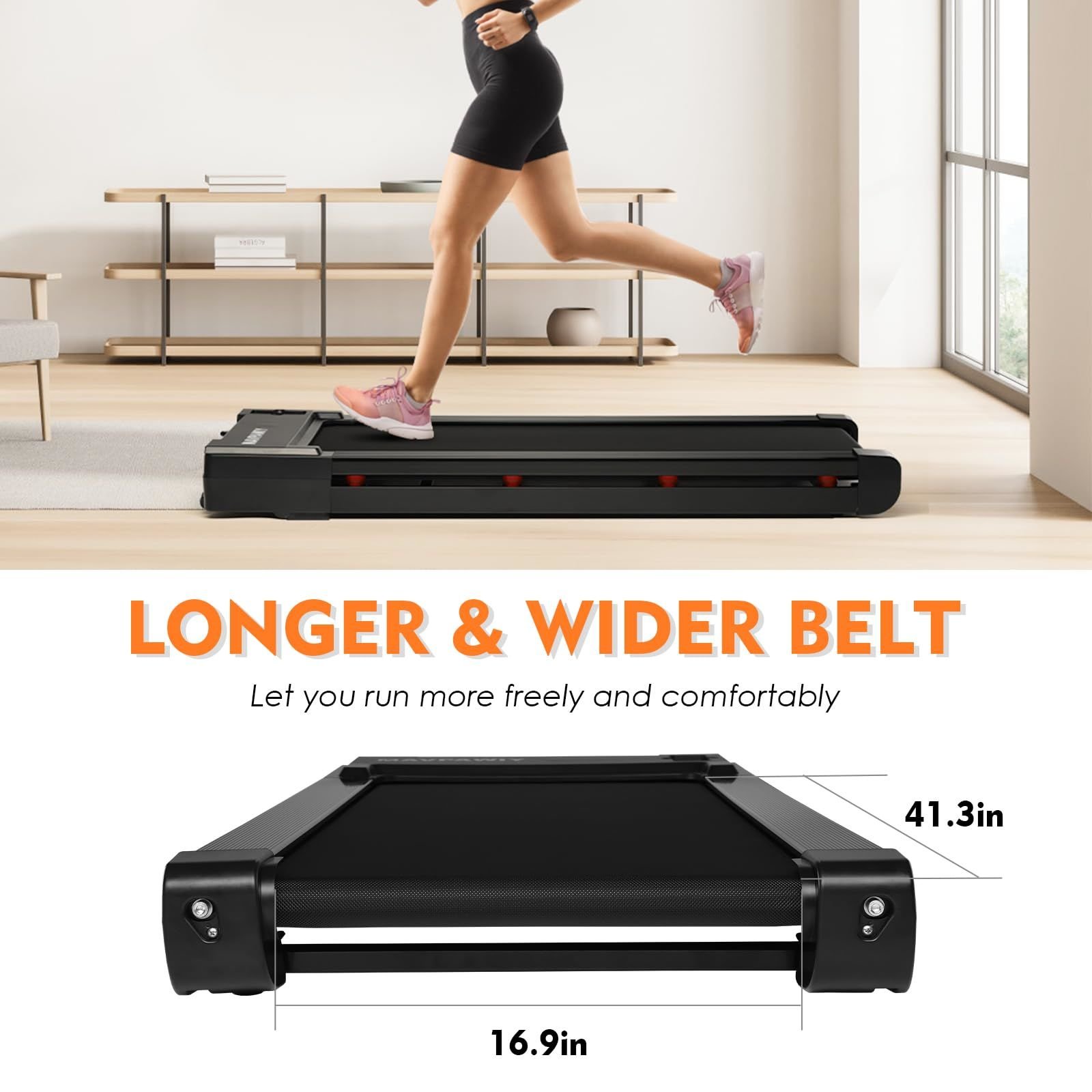 EASY TO MOVE & STORE: Relying on the space-saving design, the flat slim treadmill is only 49.2" x 19.3" x 4.9'' thick and can be easily placed under your work desk, bed or sofa with the built-in wheels, and you can also unfold the support frame to place the treadmill upright against a wall or in a corner, which is very convenient.