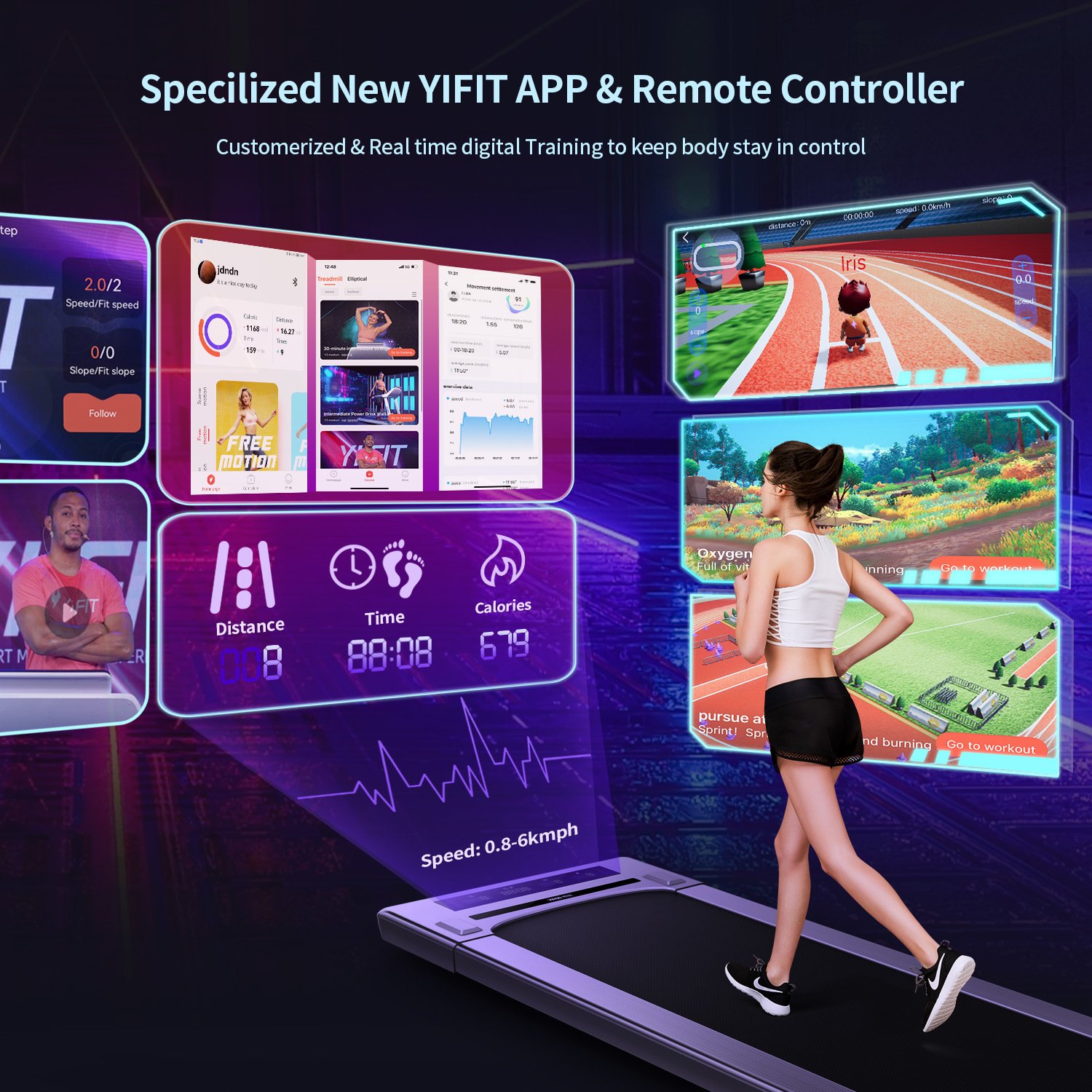 [APP and Remote Control Treadmill]Large LED display, Smart Workout APP----YIFIT walking pad desk treadmill you can use remote control or APP to control your treadmill when you walking or running with Start or Off and Speed button. Special made Smart Workout APP can control the speed,time, mileage and calories, monitor and track your workout on your phone ,or set up the training program at the same time.